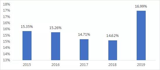 2015-2019年我國城市平均供水管網漏損率(單位:%)