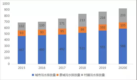 污水排放量持續上升,污水處理能力亟待增強。除了供水外,污水處理也是目前水務行業重點關注的領域之一。從污水處理的供給來看,由于城鎮化和經濟發展需求,我國城市近年來污水產生量和處理量呈上升趨勢。截至2019年底,全國城市污水排放量為555億噸,縣城污水排放量為102億噸,村鎮污水排放量為216億噸,合計873億噸。據預測,我國2020年城市污水排放量為588億噸,縣城污水排放量為105億噸,村鎮污水排放量為233億噸,合計926億噸。我國城鎮污水處理能力亟待增強。