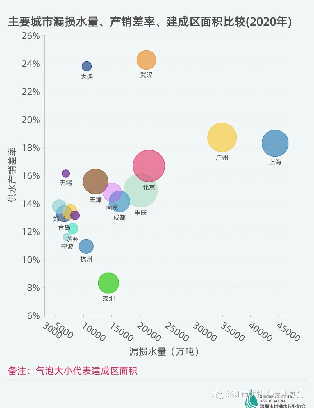 一般而言,在各大城市中,居民家庭用水在售水總量中所占比例最大,盡管這些主要城市在售水總量上差異很大,但在用水結(jié)構(gòu)的比例上趨向一致。分析售水的市場結(jié)構(gòu),對于預(yù)測城市未來用水需求,合理制訂水價(jià)體系,科學(xué)制定城市供水發(fā)展規(guī)劃,具有指導(dǎo)作用。我們將繼續(xù)引入漏損水量和城市建成區(qū)面積兩類數(shù)據(jù),并且把它們和產(chǎn)銷差率一同比較。