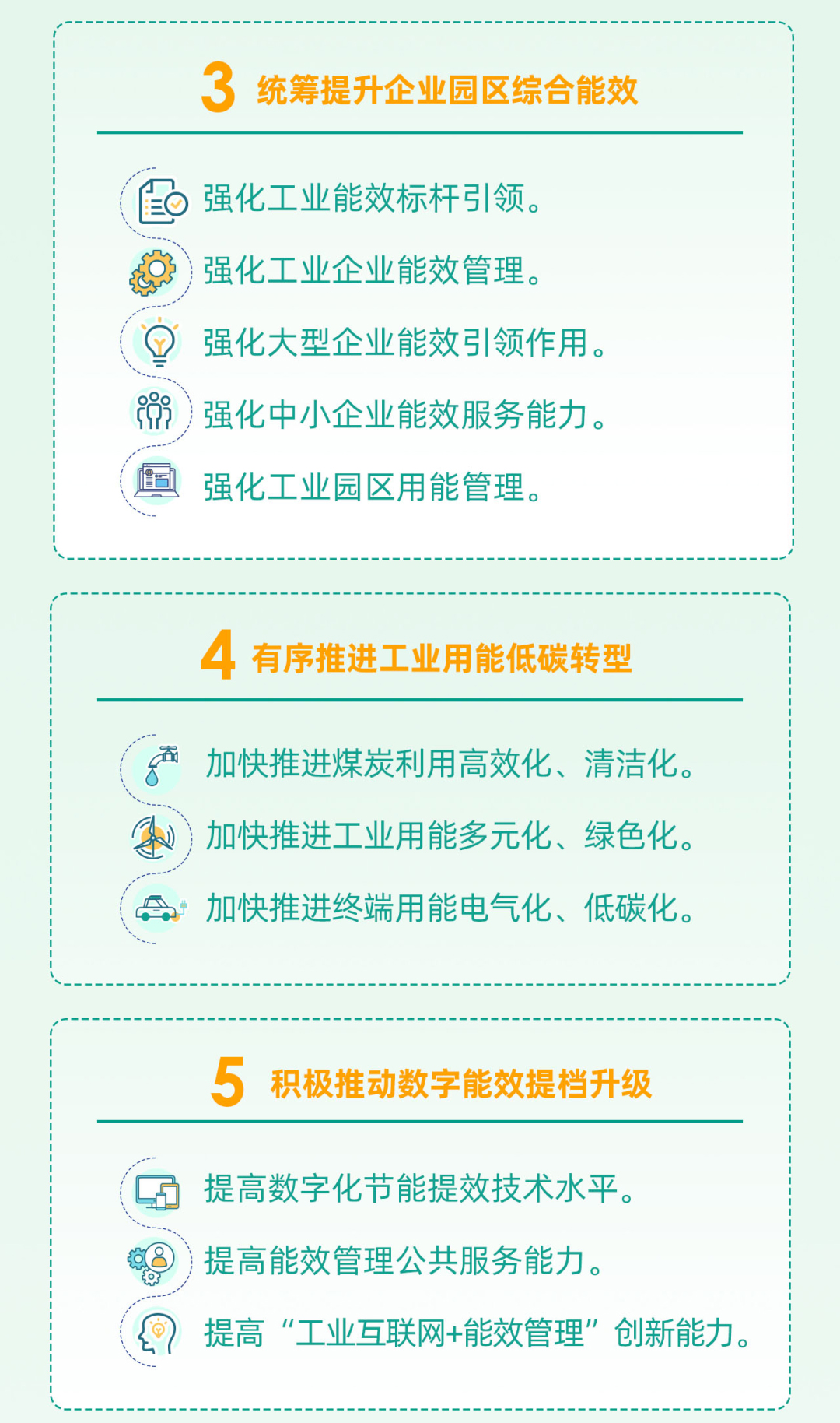 《行動計劃》聚焦重點用能行業、重點用能領域和重點用能設備,分業施策,分類推進,系統提升工業能效水平;加強全鏈條、全維度、全過程用能管理,強化標準引領和節能服務,協同提升大中小企業、工業園區能效水平;統籌優化工業用能結構、數字賦能等對節能提效的促進作用,全面提升工業能效基礎。具體提出7個方面任務: