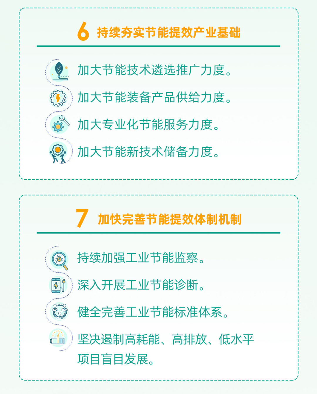 七是加快完善節能提效體制機制。健全完善工業節能有關政策、法規、標準,強化節能監督管理和診斷服務,夯實工業能效提升基礎。